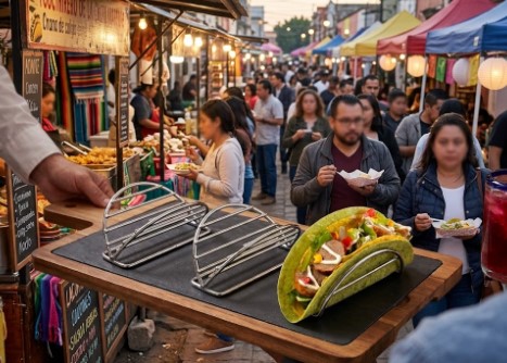 Heavy-duty stainless steel taco holder designed to keep tacos upright, stable, and mess-free during filling and serving. Suitable for home kitchens, BBQs, and restaurants.